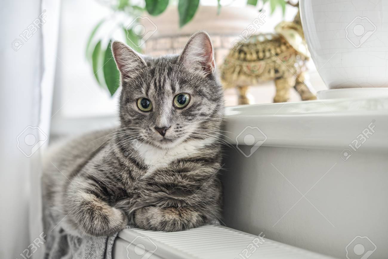 Cute Grey Cat With Green Eyes Relaxing On The Warm Radiator Closeup